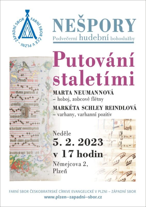 Druhá neděle po Narození Páně 4. ledna 2026 Bohoslužby se slavením sv. večeře Páně vede a kázáním slouží výpomocný kazatel bratr Jiří Tomášek.17:00 Hudební nešporyHudební nešporyLed 4 @ 17:00 – 18:00